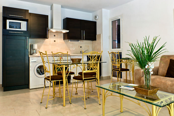 Appartement constitué d'une kitchenette équipée : rangements hauts et bas, évier, égouttoir, réfrigérateur encastré, plaque vitrocéramique tactile 4 feux, hotte aspirante, four encastré, four micro-ondes, lave-vaisselle selon les appartements, lave-linge. Kit petit-déjeuner : cafetière, bouilloire, grille pain, presse-agrumes, vaisselle complète et ustensiles de cuisine. Fer et table à repasser, kit ménage. TV écran plasma. Climatisation réversible dans les chambres à coucher et le séjour. kit linge disponible dans l'appartement (draps, serviettes de toilette, torchons), chaque couchage est équipé de couvertures, de draps et d'oreillers.