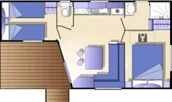 Mobil Home Méditerranée 4 Pièces 6 Personnes de 32m², composé d'une cuisine équipée, d'un séjour, d'une chambre avec un grand lit, de deux chambre avec deux lits simples, d'une salle d'eau avec douche et WC, d'une terrasse semi-couverte.