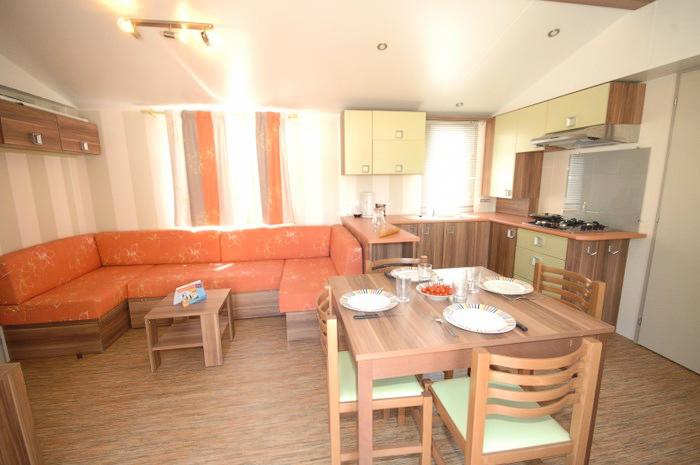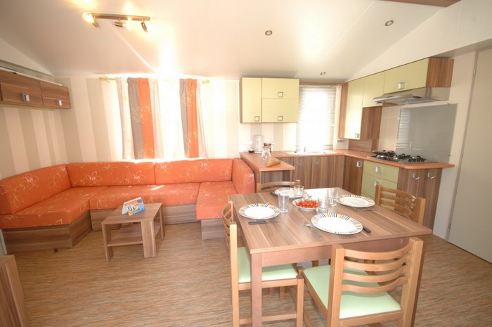 Mobil-home 3 pièces 5 adultes + 1 enfant (bébé compris) de 28m² composé d'un séjour avec une banquette convertible pour une personne, d'une kitchenette équipée, d'un coin repas, d'une chambre avec un lit double (140x190), d'une seconde chambre avec deux lits simples (80x190) et un lit superposé (ne convient pas aux enfants de moins de 10 ans) ou d'appoint, d'une salle d'eau et de WC. A noter: le 3ème lit de la chambre enfant peut être remplacé par une banquette convertible dans le salon.