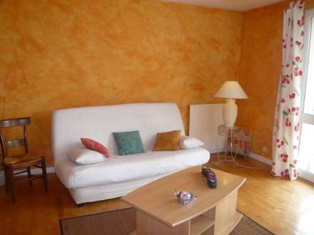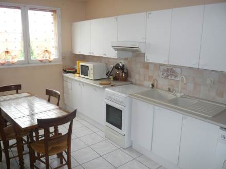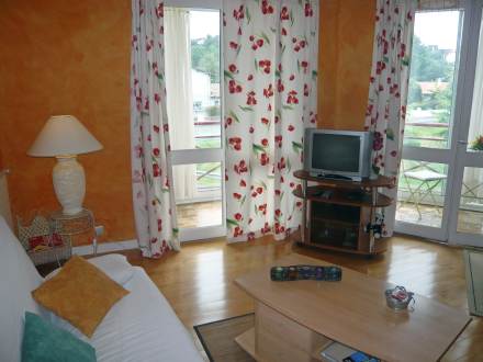 Apt 3 pièces 63 m2 au 1er étage, aménagement fonctionnel et agréable: séjour/salle à manger avec 1 divan-lit double et TV. Sortie sur la véranda. 1 chambre avec 1 grand-lit. 1 chambre avec 1 lit (90 cm). Cuisine (4 plaques de cuisson, four, four micro-ondes, congélateur) avec bar. Salle de bains, bidet, WC séparé. Chauffage au gaz. Terrasse 10 m2. A disposition: lave-linge.