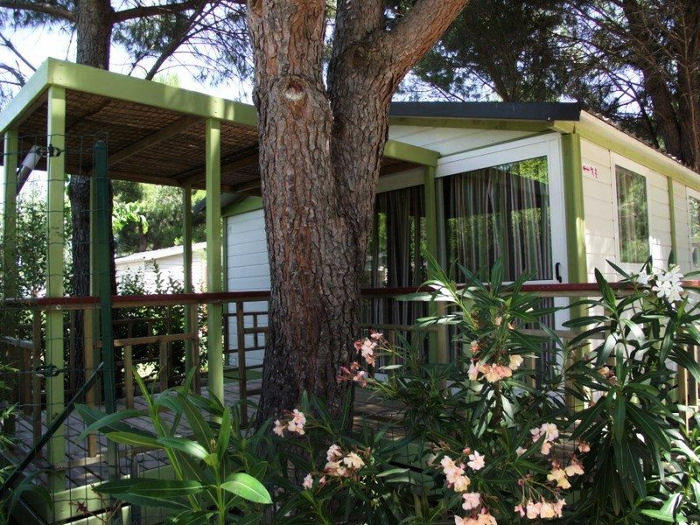 Mobil-Home pour 2 adultes et 2 enfants (de moins de 12 ans) de 15m², composé d'un coin repas, d'une chambre avec un lit double, d'une cabine avec 2 lits superposés, d'une kitchenette entièrement équipée et d'une salle de douche et de WC. Terrasse aménagée.