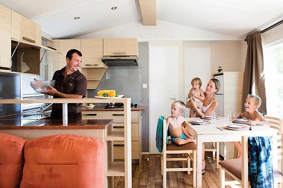 Mobil home 3 Pièces 4/6 Personnes, de 28m² environ, comprenant une chambre avec un lit double et une chambre avec 2 lits simples, une banquette pour 2 personnes dans le salon, une cuisine équipée, une salle de douche et des wc. A l'extérieur, une terrasse en bois avec mobilier de jardin.