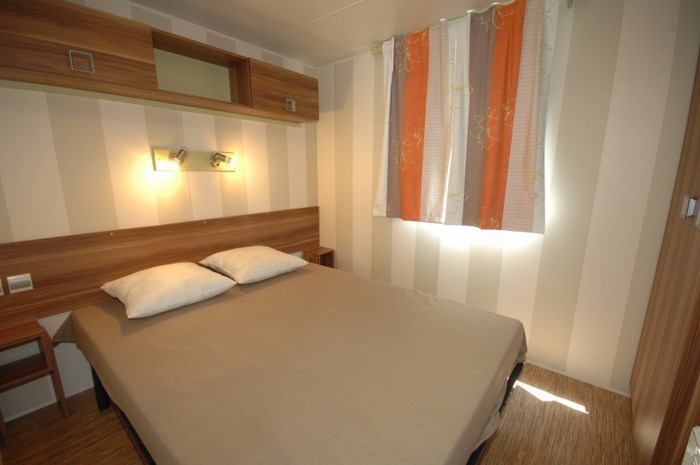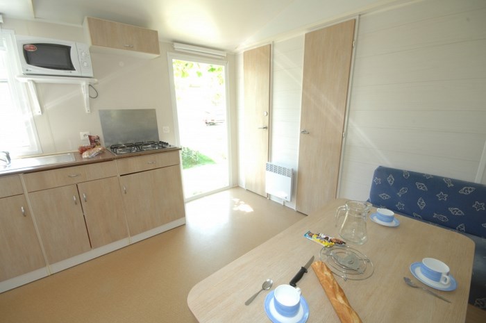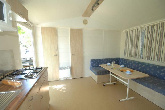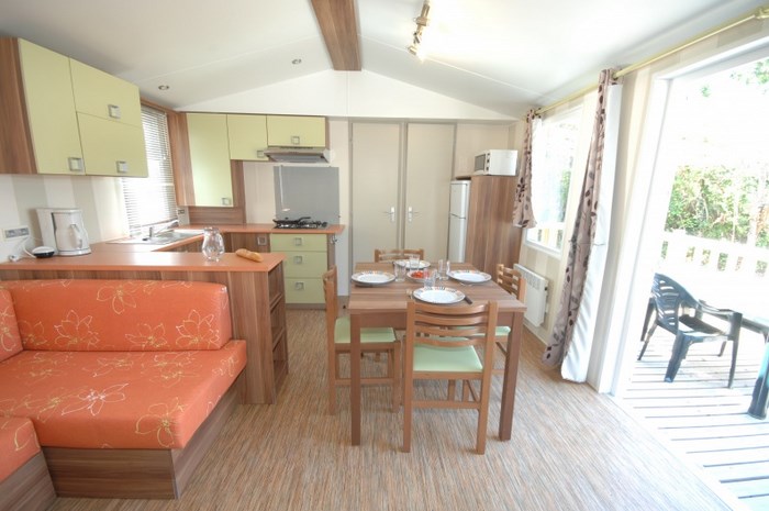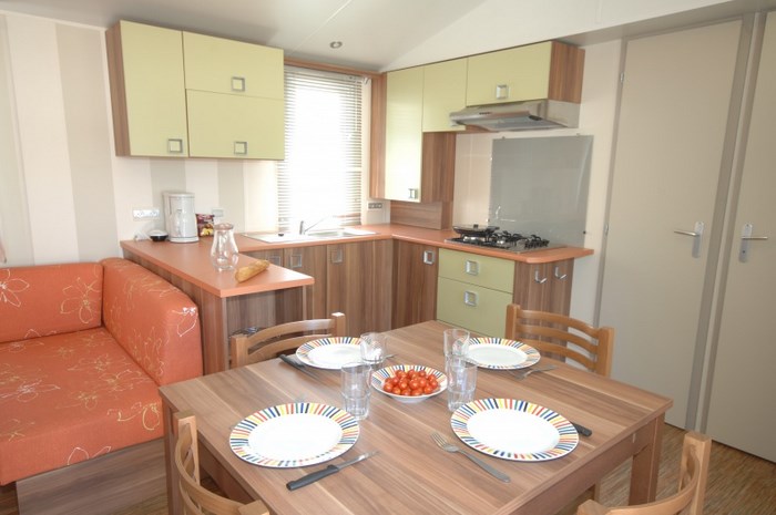 Mobil-home 3 pièces 6 personnes (bébé compris) de 28m² composé d'un séjour, d'une kitchenette équipée, d'un coin repas, d'une chambre avec un lit double (140x190), de deux chambres avec deux lits simples (80x190) chacune ou deux lits superposés chacune, d'une salle d'eau et de WC. A noter: le 3ème lit de la chambre enfant peut être remplacé par une banquette convertible dans le salon.