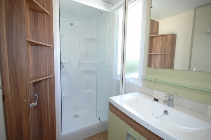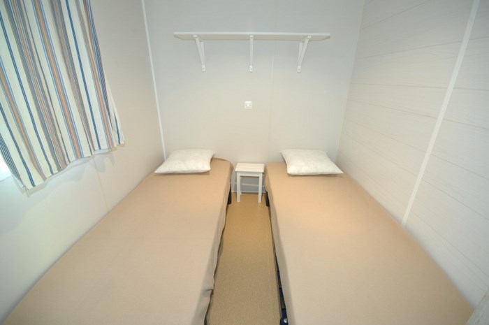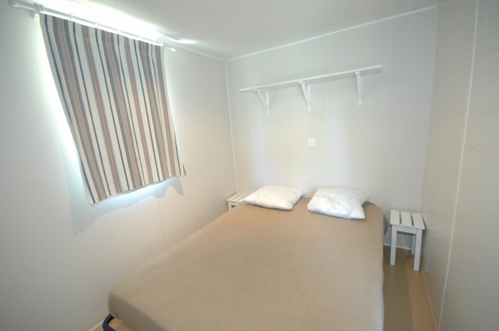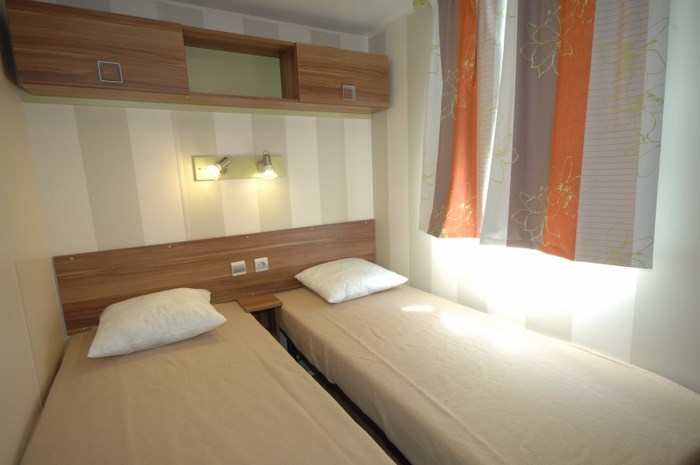 Mobil-home 3 pièces 4 adultes + 1 enfant (bébé compris) de 21m² composé d'un séjour avec une banquette convertible pour une personne, d'une kitchenette équipée, d'un coin repas, d'une chambre avec un lit double (140x190), d'une seconde chambre avec deux lits simples (80x190) et un lit superposé (ne convient pas aux enfants de moins de 10 ans) ou d'appoint, d'une salle d'eau et de WC. A noter: le 3ème lit de la chambre enfant peut être remplacé par une banquette convertible dans le salon.