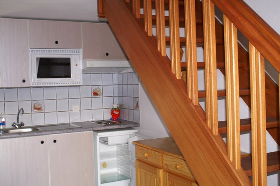 Maison d'environ 45m² pour 4 personnes, composé d'un séjour avec un coin cuisine équipé, d'une chambre avec un lit double, d'une mezzanine avec un canapé-lit pour 2 personnes, d'une salle de bains avec douche et lavabo, d'un WC séparé et d'une terrasse/jardinet.