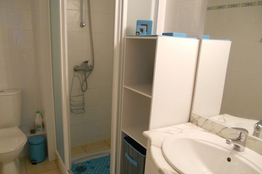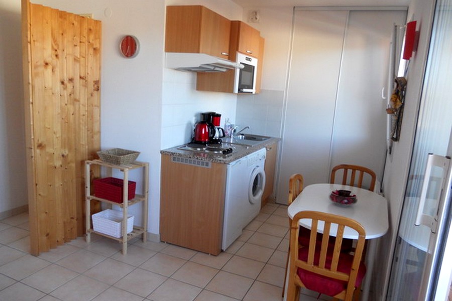 Studio de 24m² pour 2 personnes, composé d'un coin cuisine équipé, d'un séjour avec un canapé-lit pour 2 personnes, d'une salle de bains avec douche, lavabo et WC et d'une terrasse avec vue mer.