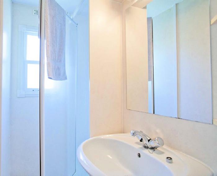 Mobil-home climatisé 4 pièces 6 personnes de 40m² composé d'un séjour, d'un coin repas, d'une kitchenette équipée, d'une chambre avec un lit double (160), d'une salle de bains privatisée reliée à la chambre des parents avec douche-lavabo-WC, d'une seconde chambre avec deux lits simples (80), d'une troisième chambre avec deux lits superposés, d'une salle de bains privée reliée à la chambre des enfants avec douche-lavabo-WC et d'une terrasse.