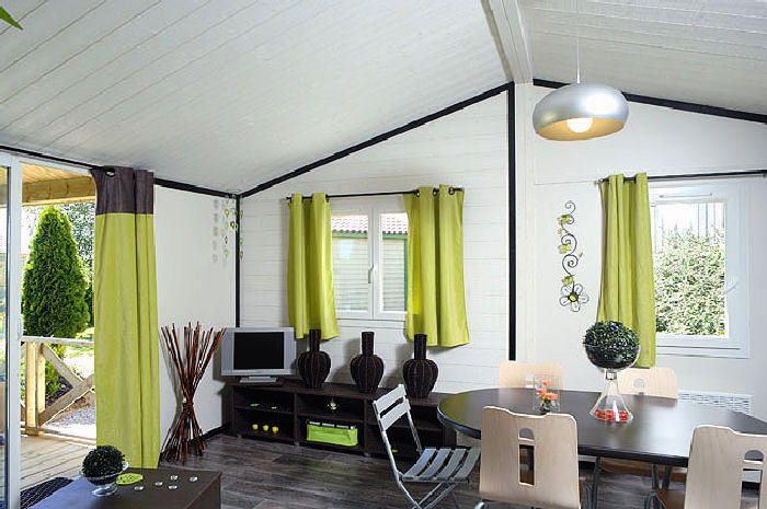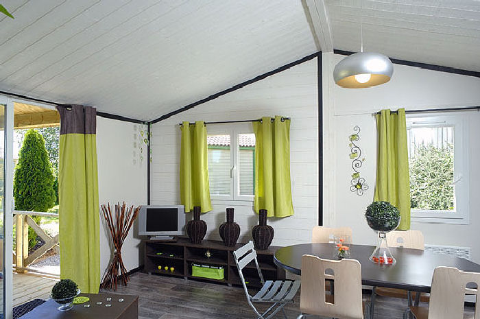 Pour avoir plus de détails et réserver cet hébergement, choisissez une date ci-dessus et cliquez sur voir l'offre ! Vous serez redirigé vers le site proposant la location.Chalet climatisé 4 pièces 6 personnes de 35m² composé d'un séjour, d'un coin repas, d'une cuisine équipée, d'une chambre avec un lit double (160), d'une seconde chambre avec deux lits simples (80), d'une troisième chambre avec deux lits superposés, d'une salle de bain avec WC séparés et d'une terrasse couverte.