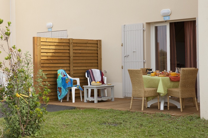 Maison 4/6 personnes de 50 à 60m², composée d'un séjour avec un canapé lit pour 2 personnes, d'une chambre avec un lit double, d'une chambre avec 2 lits simples, d'un coin cuisine équipé, d'une salle de bain avec baignoire et WC. Terrasse avec mobilier de jardin.