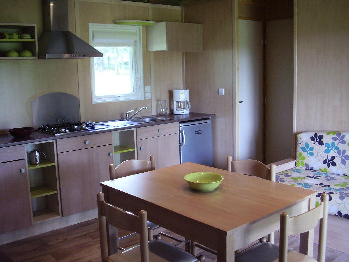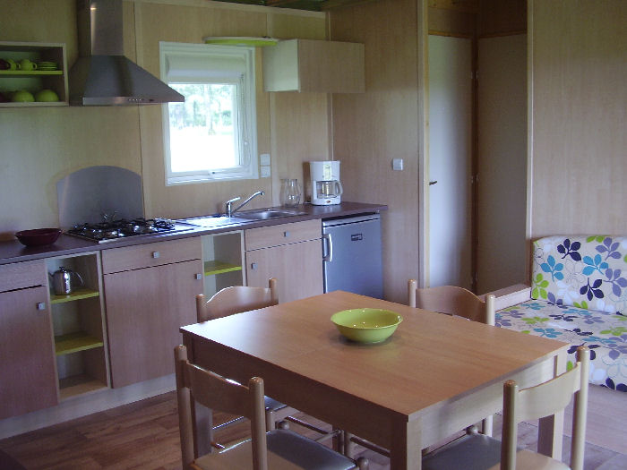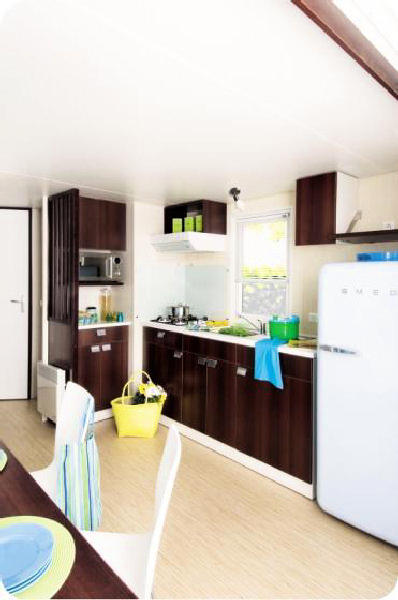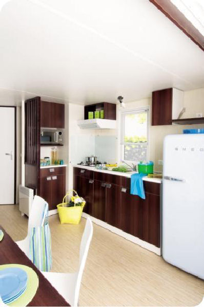Le mobil home est équipé d'une plaque de cuisson, d'un réfrigérateur-freezer, d'un micro-ondes, d'une cafetière électrique et de tous les ustensiles de cuisine.Les couvertures et oreillers sont fournis (draps en option). La terrasse possède un salon de jardin avec transat.