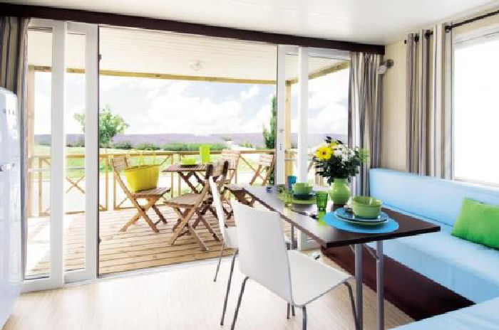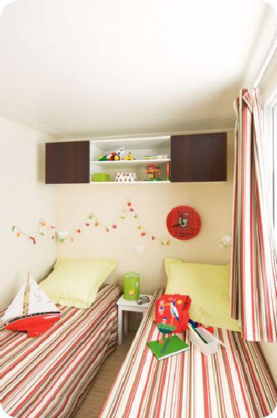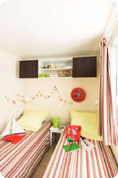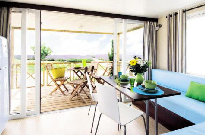 Mobil home de 27m² pour 4/6 personnes, composé d'une kitchenette équipée, d'un séjour avec un coin repas et une banquette convertible en couchage pour 2 personnes, d'une chambre avec un lit double, d'une chambre avec 2 lits simples, d'une salle de bains avec une douche, d'un WC séparé et d'une terrasse couverte.