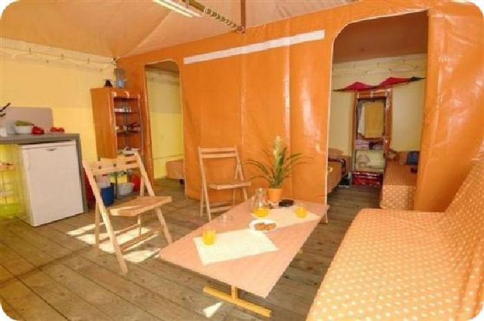 Bungalow toilé de 25m² pour 4/5 personnes, composé d'un séjour avec un coin cuisine équipée de une banquette convertible en couchage pour 2 personnes, d'un coin nuit avec d'un côté un lit double et de l'autre 2 lits simples, et d'une terrasse couverte. A noter : le bungalow ne possède pas d'arrivée d'eau (pas d'évier ni de sanitaires). Le bloc sanitaires du camping se situe à 2 pas du bungalow. Ce logement atypique est un bon compromis entre le confort d'un mobil home et les vraies valeurs du camping, au plus proche de la nature.