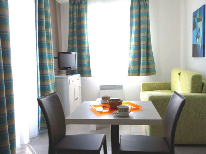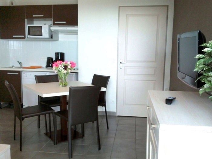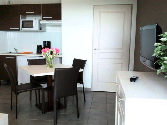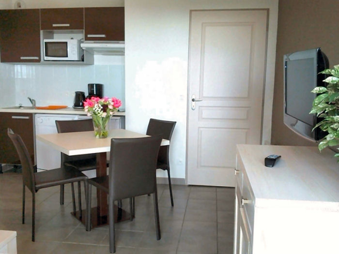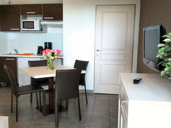 La kitchenette de cet appartement est équipé avec lave-vaisselle, four micro-ondes grill, réfrigérateur, plaque vitrocéramique 2 feux, hotte aspirante, cafetière, bouilloire, grille-pain, vaisselle, ustensiles de cuisine. Le linge de lit est fournis. Le séjour est équipé d'une télévision.