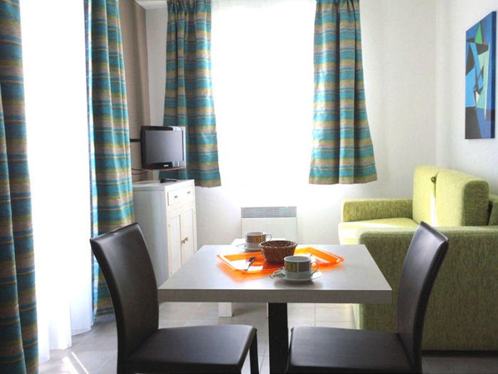 Studio 2 personnes de 25m² composé d'un séjour avec un canapé-lit pour 2 personnes, d'une kitchenette équipée et d'une salle de bains avec toilettes (parfois séparés). La plupart des logements disposent d'une vue mer.
