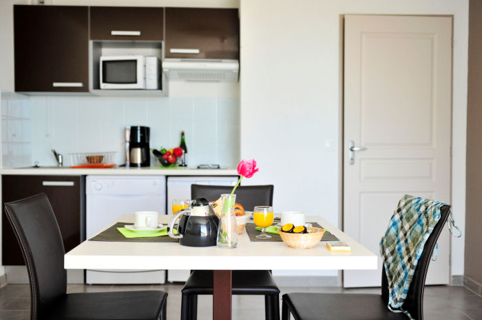 La kitchenette de cet appartement est équipé avec lave-vaisselle, four micro-ondes grill, réfrigérateur, plaque vitrocéramique 2 feux, hotte aspirante, cafetière, bouilloire, grille-pain, vaisselle, ustensiles de cuisine.
