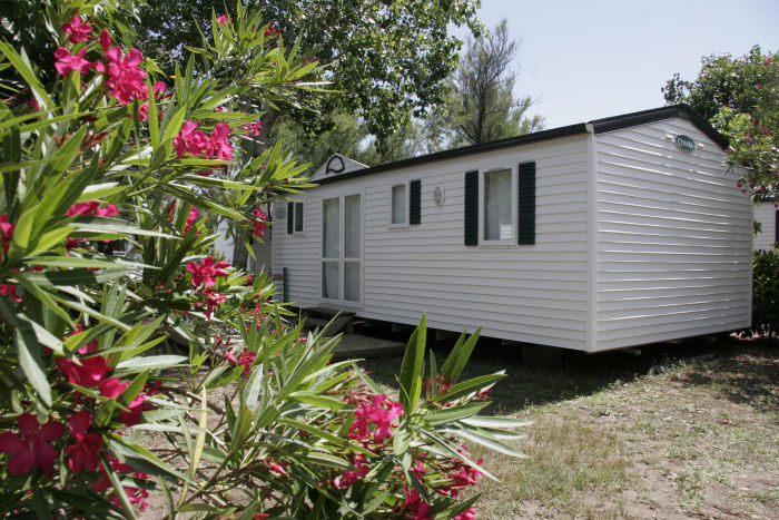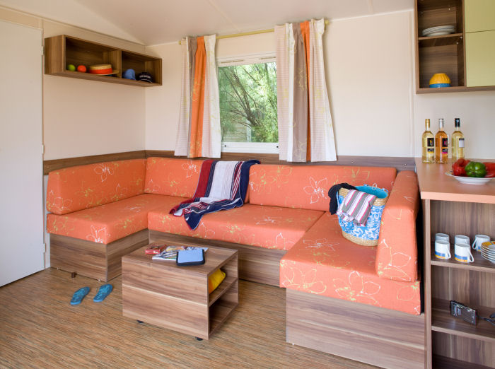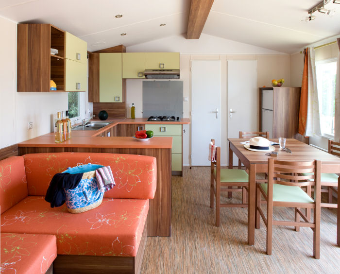 Mobil home d'environ 30m² pour 6 personnes, composé d'une kitchenette équipée, d'un séjour avec une banquette, d'une chambre avec un lit double, de 2 chambres avec 2 lits simples (ou une chambre avec un lit double et une chambre avec 2 lits superposés), d'une salle de bains avec une douche et des WC indépendants. Capacité maximum: 6 Personnes bébé compris.