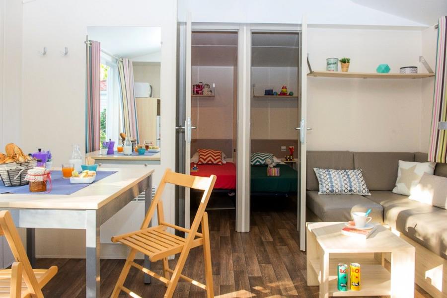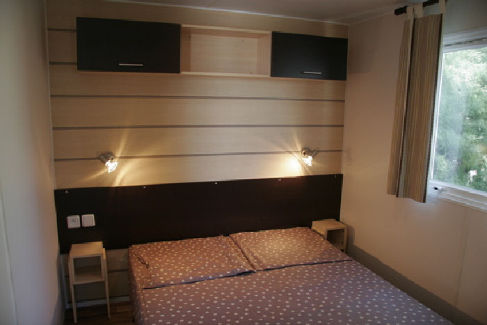 Mobil Home 3 Pièces 6 Personnes de 22m² minimum composé d'un coin repas, d'un coin cuisine équipé, d'une chambre avec 1 lit double (140x190cm), d'une chambre avec 2 lits de maximum 80x190m et 1 lit superposé (ne convient pas aux enfants de moins de 10 ans) ou d'appoint, d'une salle d'eau avec lavabo/douche et WC. A noter: Sur certains campings, le troisième lit de la chambre d’enfants est remplacé par une banquette convertible dans le salon.Capacité du logement: 5 adultes + 1 enfant bébé compris.