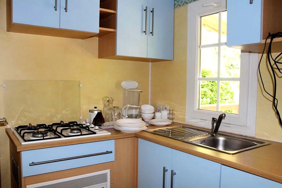 Le mobil-home est équipé d'un coin cuisine avec feux à gaz, réfrigérateur, micro-ondes et de toute la vaisselle nécessaire pour 4 personnes. Terrasse avec salon de jardin, parasol et bain de soleil.