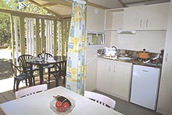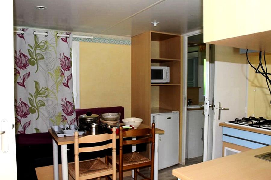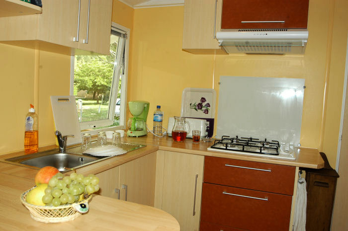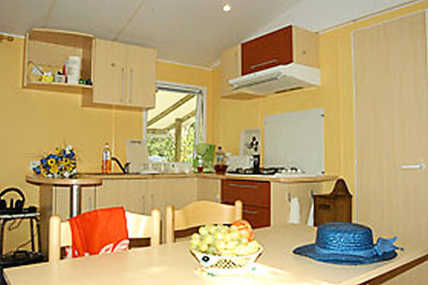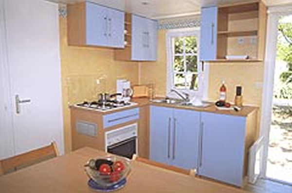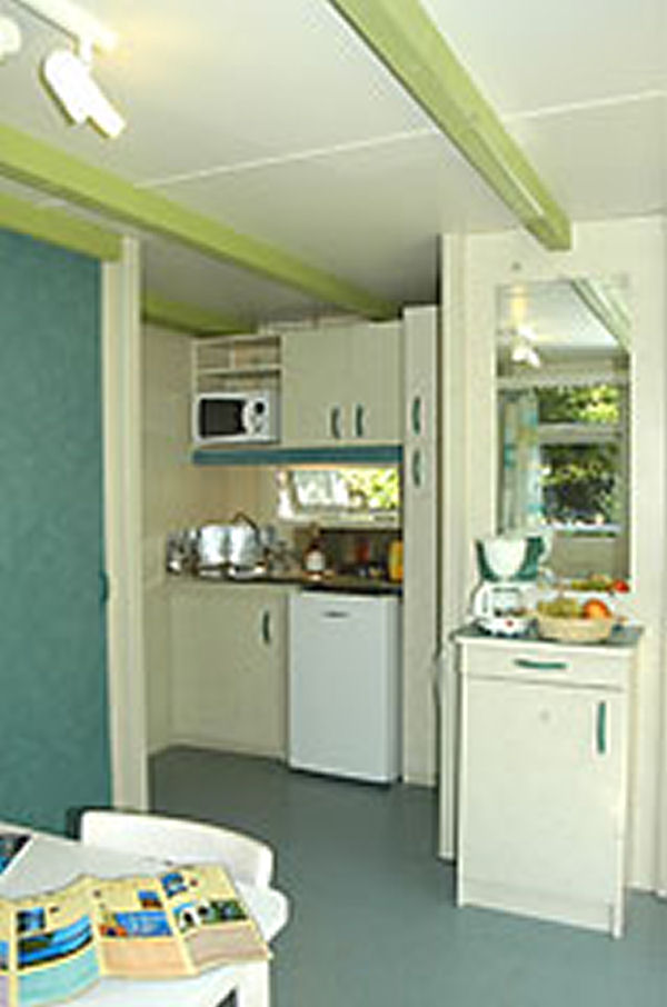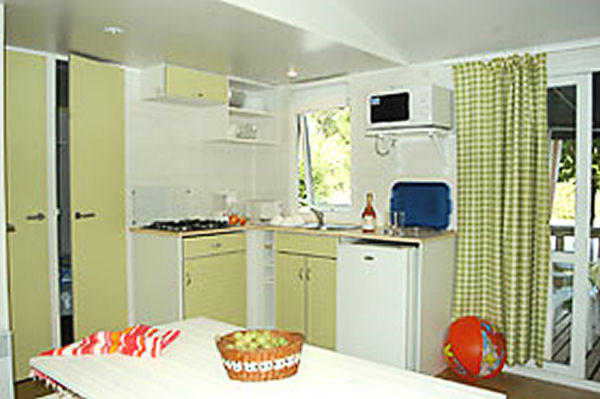 Le mobil-home est équipé d'une cuisine avec feux au gaz, d'un réfrigérateur, d'un congélateur, d'un évier (eau chaude et froide), d'un micro-ondes et de la vaisselle nécessaire pour 4 personnes. 4 radiateurs. Terrasse couverte avec salon de jardin et bain de soleil.