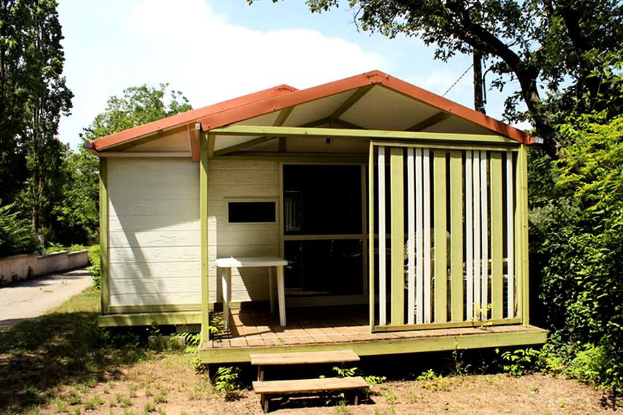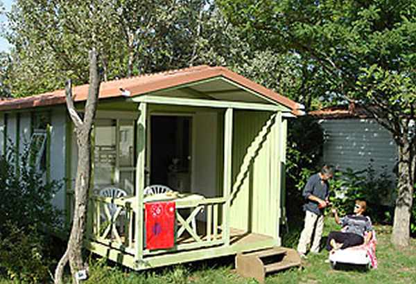 Chalet de 25m² environ pour 5 personnes, composé d'un coin cuisine, d'une chambre avec un lit double, d'une chambre avec 2 lits superposés et 1 lit simple, d'un séjour ouvert sur la terrasse par une large baie vitrée, d'une salle d'eau avec douche, d'un WC et d'une terrasse couverte.