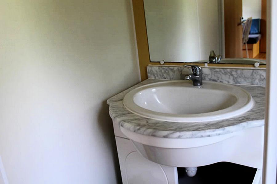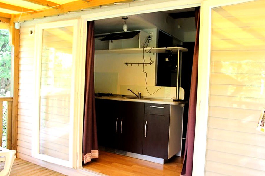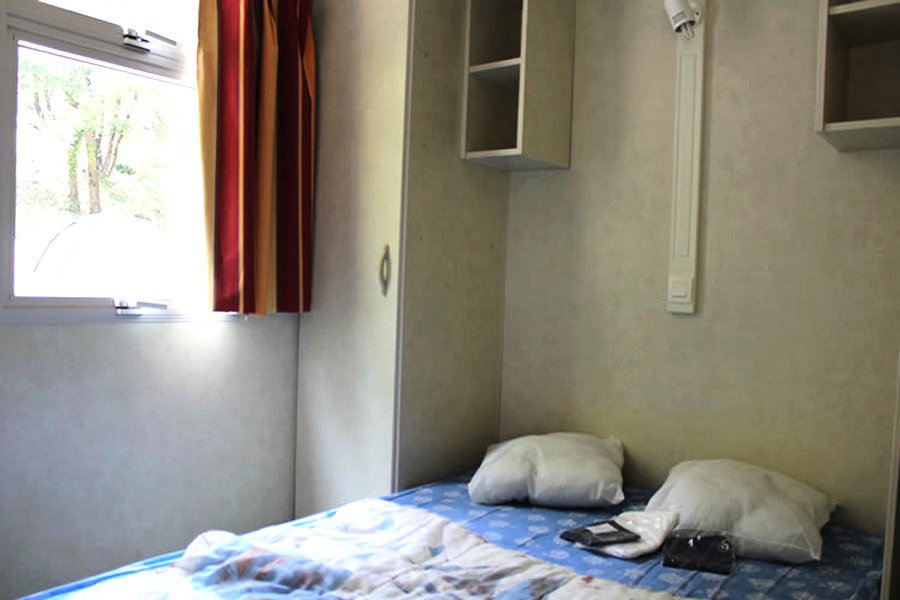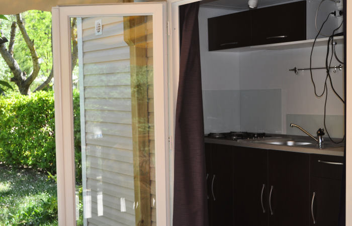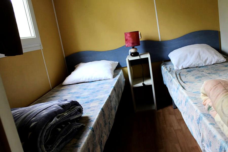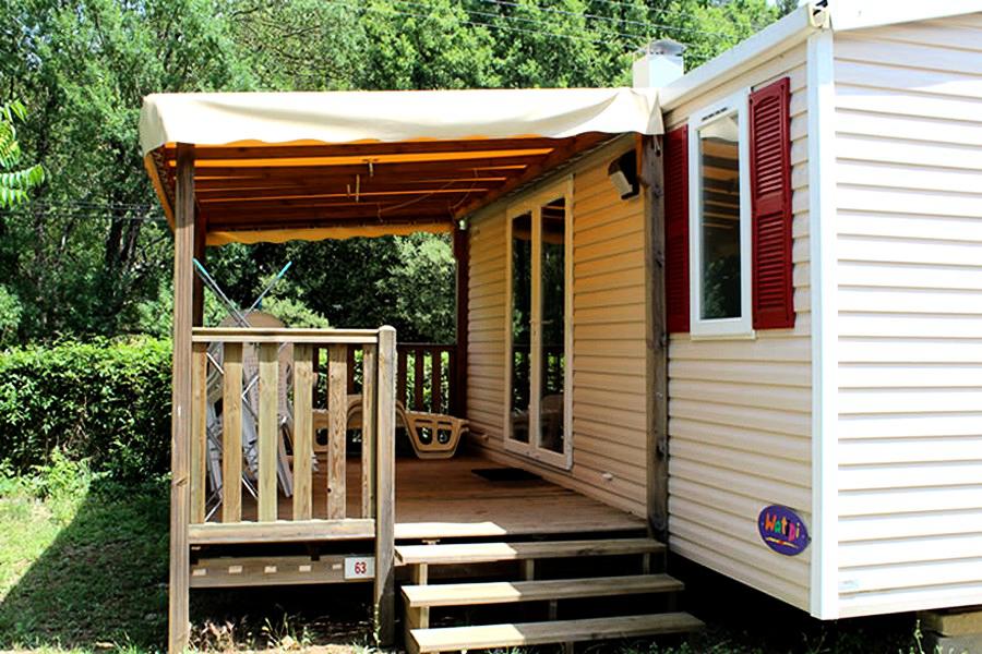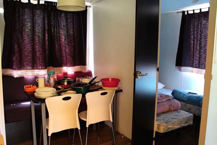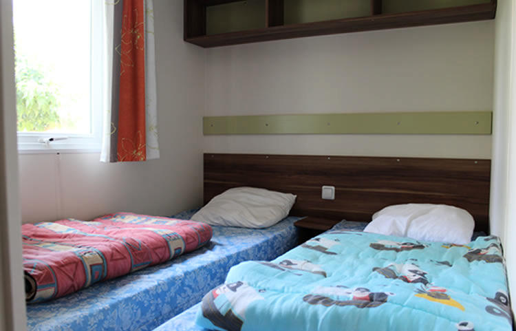 Mobil Home de 25m² environ 4 personnes, composé d'un coin cuisine, d'une chambre avec un lit double, d'une chambre avec 2 lits superposés, d'un séjour ouvert sur la terrasse par une baie vitrée, d'une salle d'eau avec douche, d'un WC et d'une terrasse couverte.