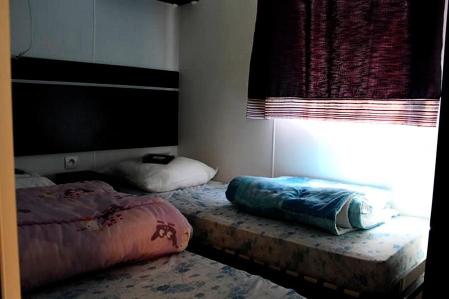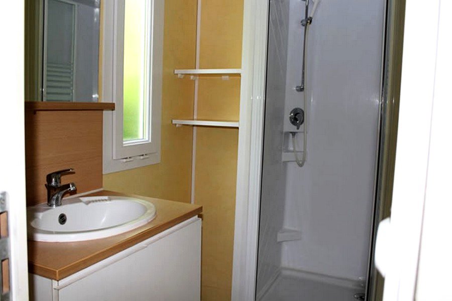 Mobil Home de 32 m² pour 6 personnes, composé d'un coin cuisine, d'une chambre avec un lit double, de 2 chambres avec 2 lits simples séparés, d'un séjour donnant sur la terrasse par une large porte fenêtre, d'une salle d'eau avec douche, d'un WC et d'une terrasse.