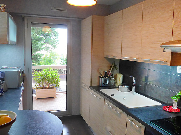 Apt 3 pièces 65 m2, à l'entresol, clair, aménagement fonctionnel et agréable: séjour/salle à manger avec table pour les repas et TV (écran plat). Sortie sur la terrasse, orientée est et orientée ouest. 1 chambre avec 1 lit double (1 x 140 cm). Sortie sur la terrasse. 1 chambre avec 1 lit double (1 x 140 cm), TV (écran plat). Cuisine (four, lave-vaisselle, 3 plaques vitrocéramique, four micro-ondes, cafetière électrique). Sortie sur la terrasse. Salle de bains, bain/douche, WC séparé. Terrasse 8 m2, situation est et situation ouest terrasse 8 m2. Meubles de terrasse, barbecue. Belle vue sur le jardin. A disposition: lave-linge. Internet (Connexion WIFI). Place de parking.