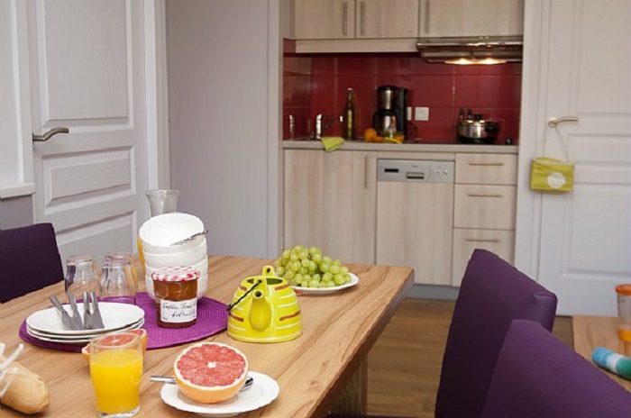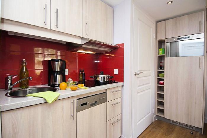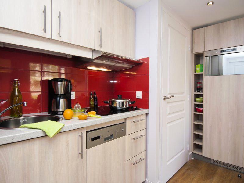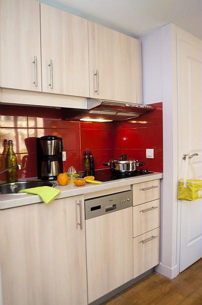 L'appartement comprend un coin cuisine entièrement équipé de 2 plaques vitrocéramiques, d'un réfrigérateur, d'un mini-four, d'un mini lave-vaisselle, d'une cafetière électrique.