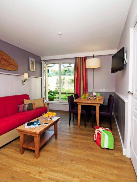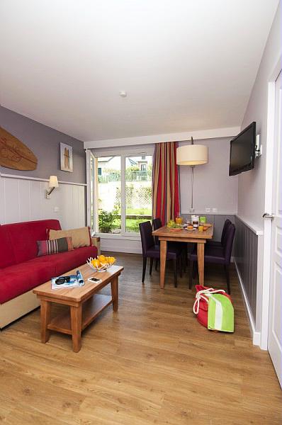 Appartement 2 Pièces 4 Personnes d'environ 40m² comprenant un séjour avec un canapé convertible (2 couchages, une chambre avec deux lits simples, un coin cuisine tout équipé, une salle de bain avec baignoire et des toilettes séparés ou non.