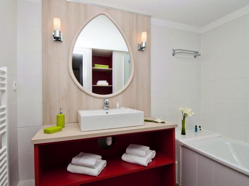 Appartement de deux pièces pour six personnes d'environ 50m² comprenant un séjour avec deux banquettes lits et lit gigogne ou une banquette lit gigogne avec deux lits simples, une chambre avec deux lits simples, une salle de bain et des toilettes séparés dans la plupart des appartements.