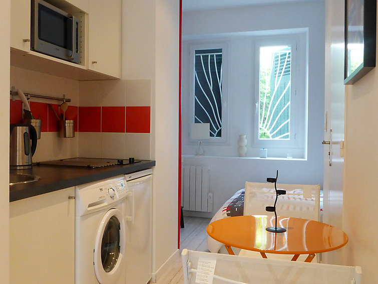 Studio 27 m2, au rez-de-chaussée, complétement rénové, aménagement moderne et de bon goût: séjour. Alcôve avec 1 grand-lit (1 x 140 cm). Cuisine ouverte (2 plaques vitrocéramique, four micro-ondes). Douche, WC séparé. Chauffage électrique. A disposition: lave-linge.