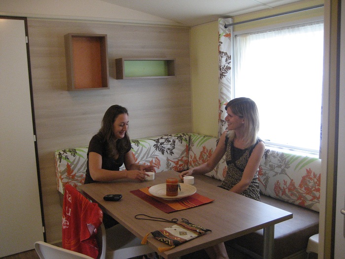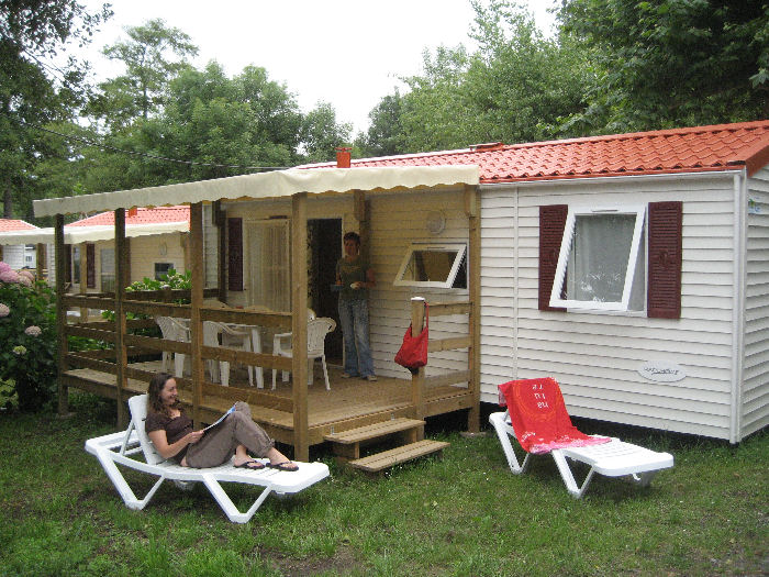 Mobil Home de 4 pièces pour 7 personnes de 30m² composé d'une chambre avec un lit double et de 2 autres chambres comprenant chacune 2 lits simples, d'un salon avec une banquette pour un couchage, d'un coin cuisine, d'une salle de douche et de WC indépendants. Terrasse couverte.