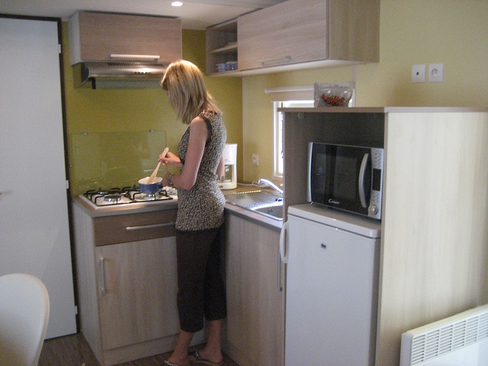 Le coin cuisine est équipé d'un réfrigérateur, de feux de cuisson, d'un micro-ondes, d'une cafetière électrique et de l'ensemble de la vaisselle. Pour chaque couchage, vous trouverez couvertures, alèses jetables et oreillers. Pour la terrasse vous disposerez d'un salon de jardin et de 2 transats.