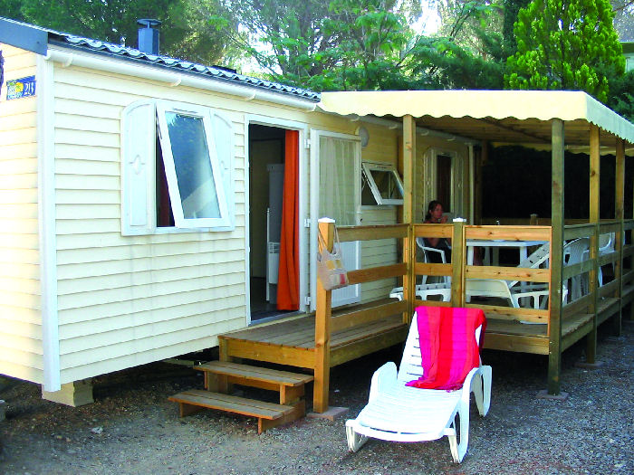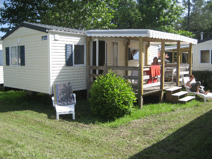 Mobil Home de 3 pièces pour 5 à 6 personnes de 28m² composé d'une chambre avec un lit double, d'une chambre comprenant 3 lits simples dont un superposé, d'un salon avec une banquette un couchage pour 1 personne, d'un coin cuisine, d'une salle de douche et de WC indépendants. Terrasse couverte.