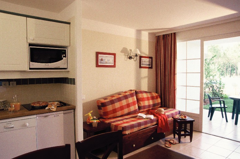 Appartement équipé d'une kitchenette avec 4 plaques vitrocéramiques, d'un réfrigérateur, d'un four micro ondes, d'un lave vaisselle et d'une cafetière électrique. Télévision, téléphone (payant). Appartement au rez de chaussée avec terrasse avec mobilier de jardin.