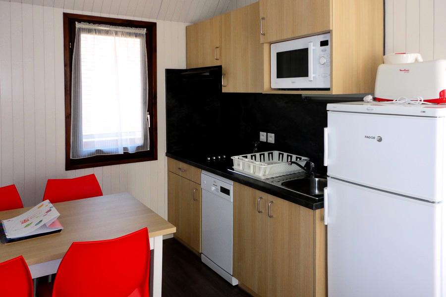 Chalet 3 pièces pour 5 personnes de 33m², composée d'une kitchenette, d'un séjour, d'une chambre avec un grand lit, d'une chambre avec 1 lit simple et 2 lits superposés, d'une salle de bains avec WC et d'une terrasse. A noter : logement en demi-pension et pension complète. Possibilité d'ajouter un lit bébé : sur demande auprès de notre service réservation