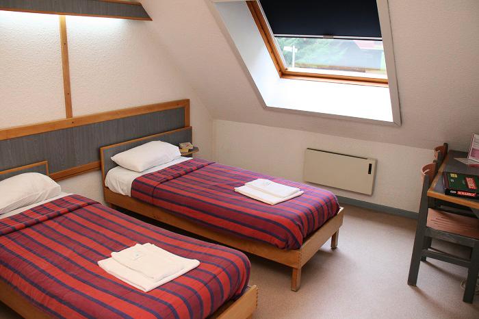Chambre pour 2 personnes de 14.5 à 20m², composée de 2 lits simples, d'une salle de bains avec douche et WC. A noter : logement en demi-pension ou pension complète. Ajout d'un lit bébé impossible.