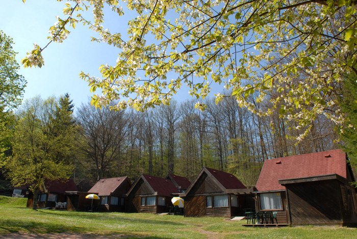 Chalet pour 5 personnes de 33m², composée d'une kitchenette, d'une séjour, d'une chambre avec un grand lit, d'une chambre avec 1 lit simple et 2 lits superposés, d'une salle de bains avec WC et d'une terrasse.A noter : logement en demi-pension et pension complète.