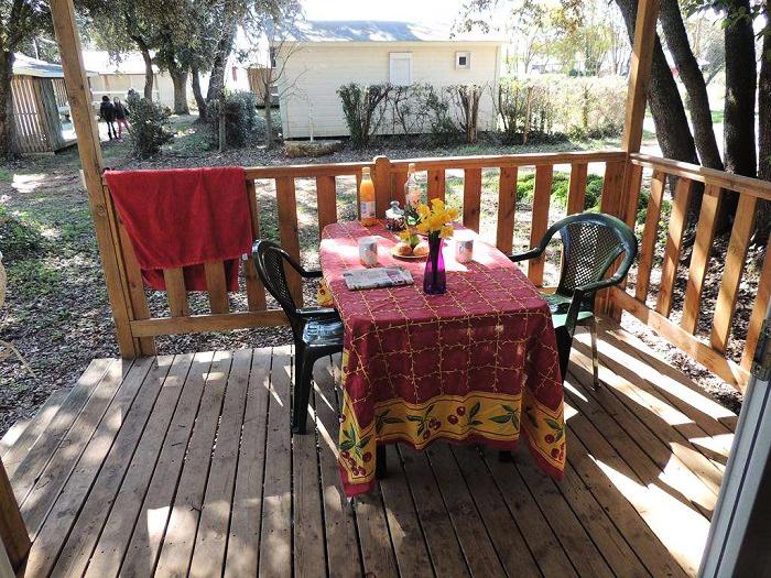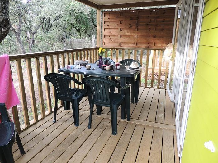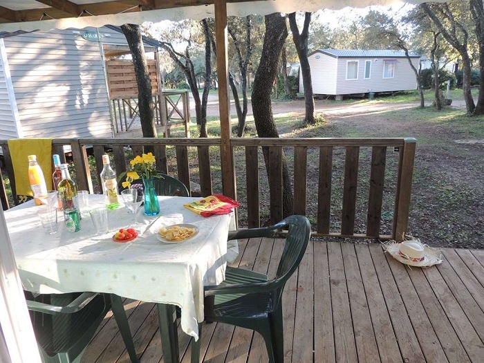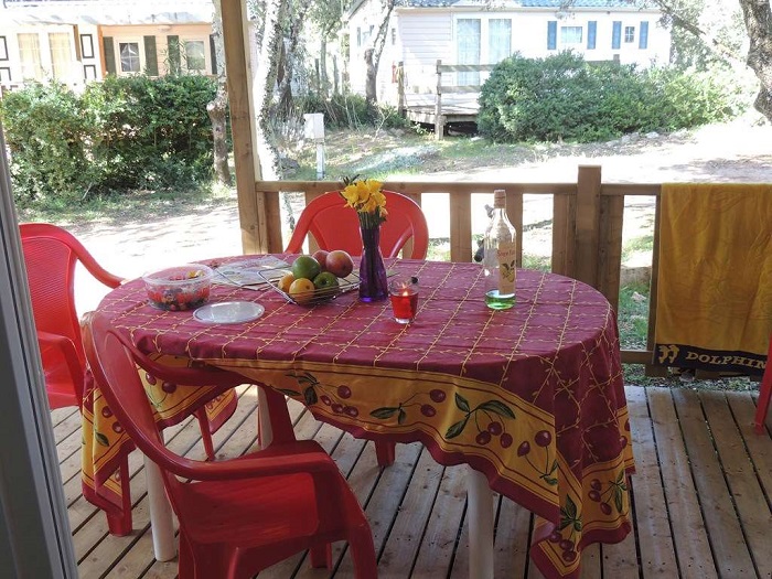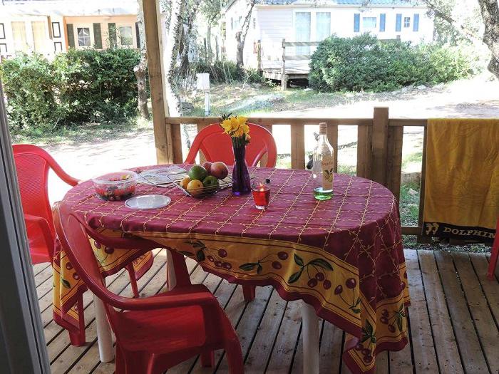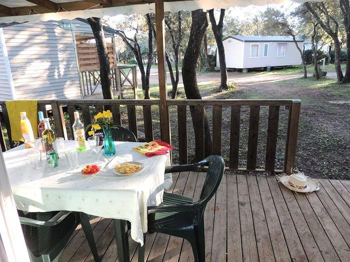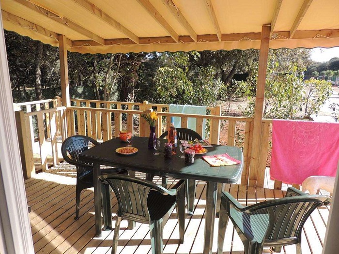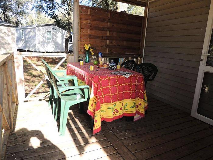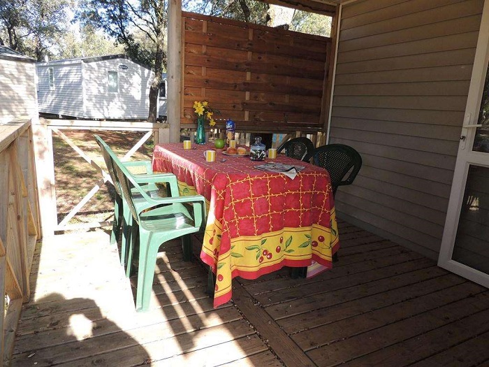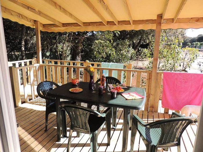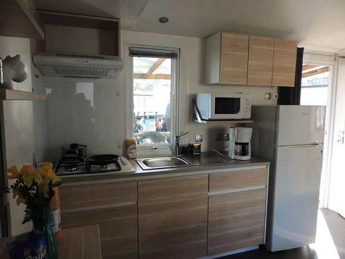 Le mobil home comprend une cuisine équipée avec 4 plaques de cuisson, micro-ondes, grille-pain, frigo / congélateur, cafetière électrique et vaisselle. Il dispose également  d'une terrasse couverte avec salon de jardin.Les couvertures et oreillers sont fournis.