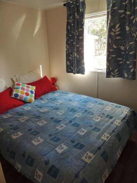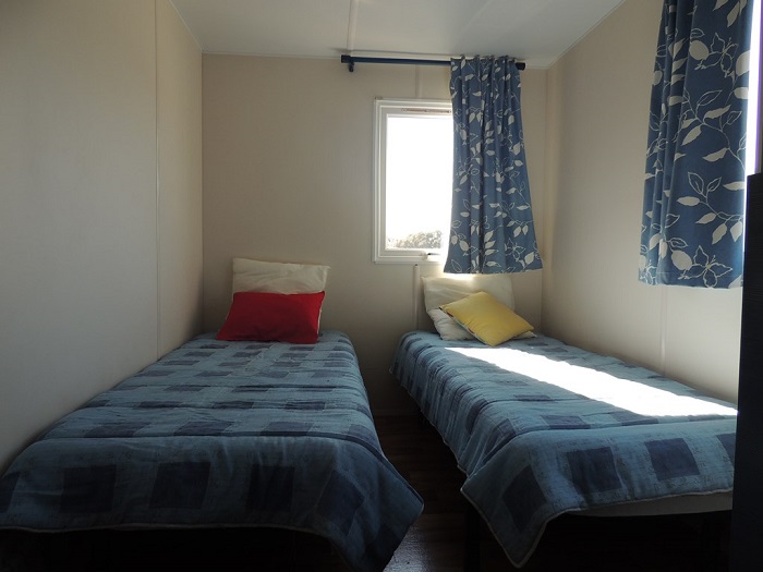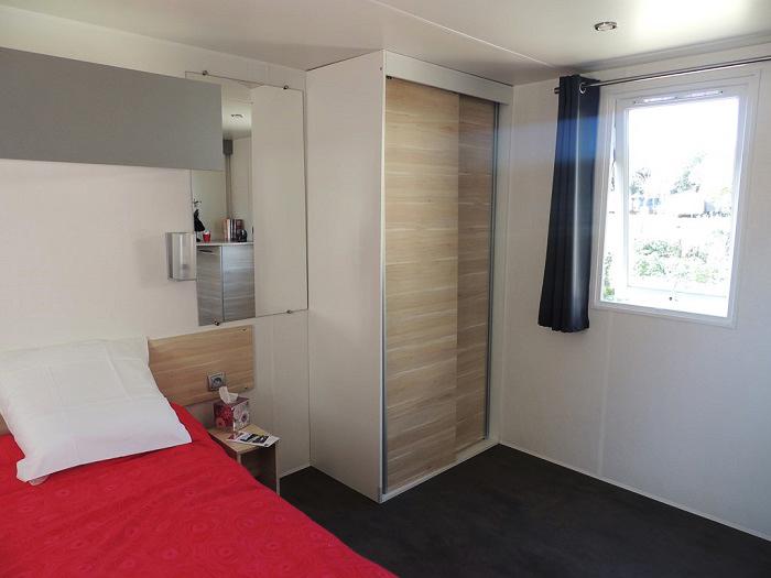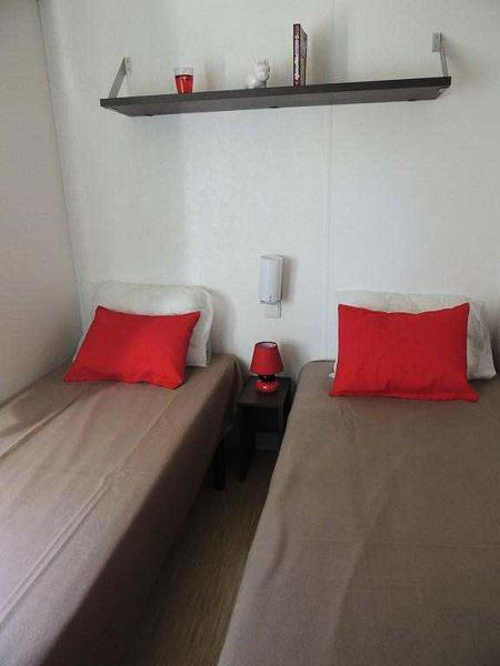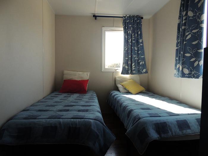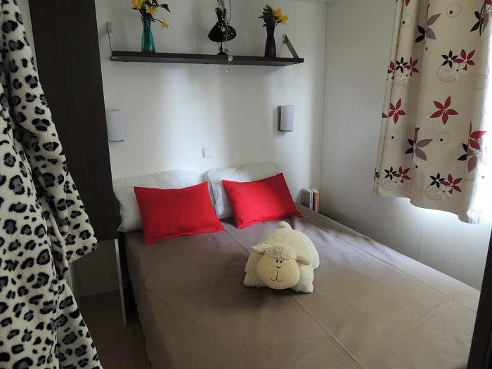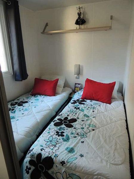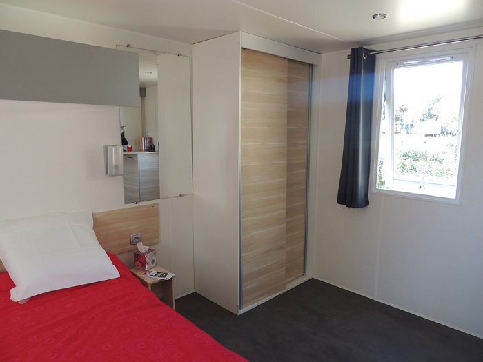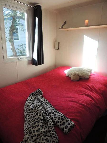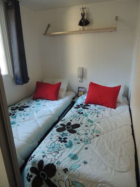 Mobil Home 5 personnes, de 25m², composé d'une cuisine, d'une chambre avec un lit double, d'une chambre avec 3 lits simples et d'une salle de bains avec douche et WC.