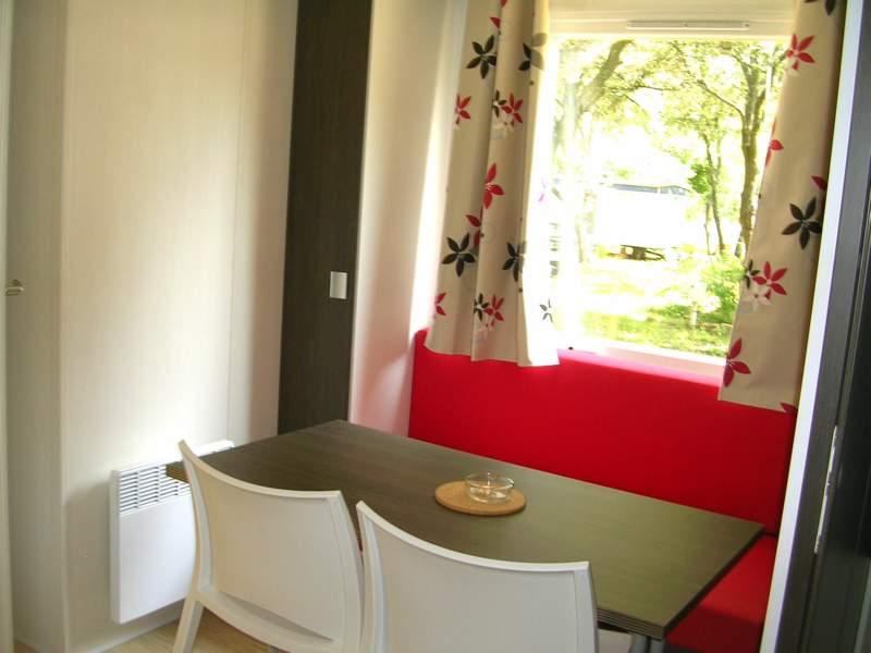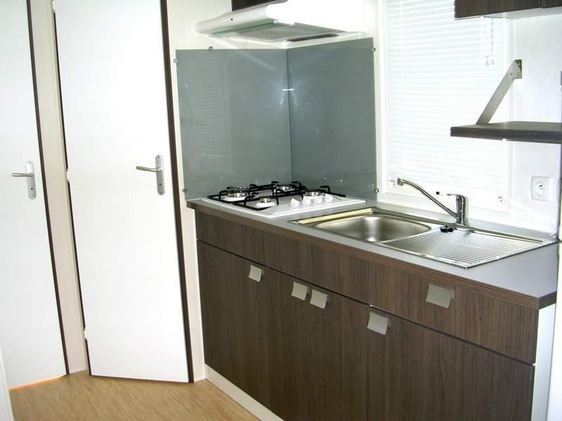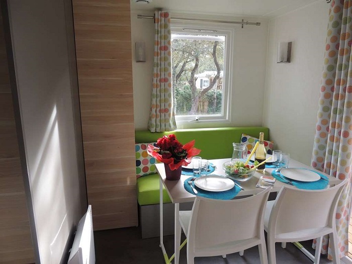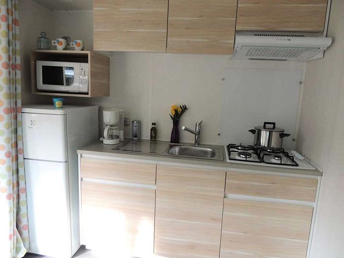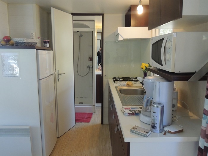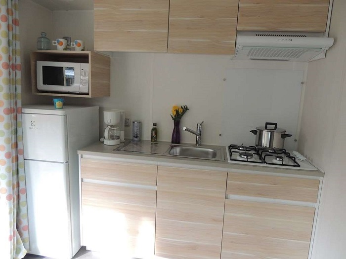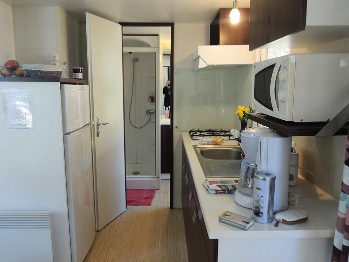 Le mobil home comprend une cuisine équipée avec 4 plaques de cuisson, micro-ondes, grille-pain, frigo / congélateur, cafetière électrique et vaisselle.