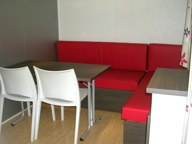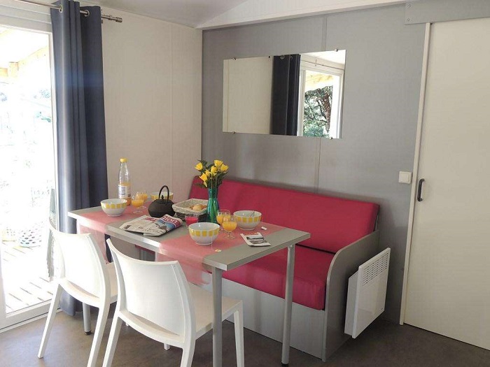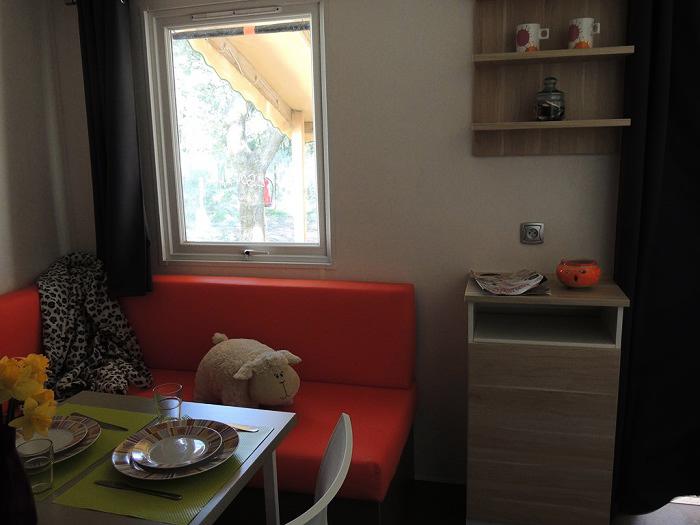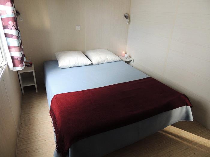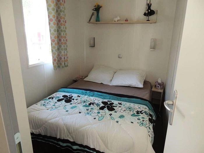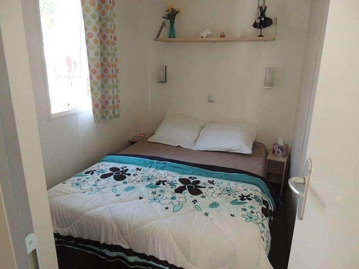 Mobil home 2/4 personnes, de 19m², composé d'une cuisine, d'un salon avec canapé convertible en couchage pour 2 personnes, d'une chambre avec un lit double et d'une salle de bains avec douche et WC.