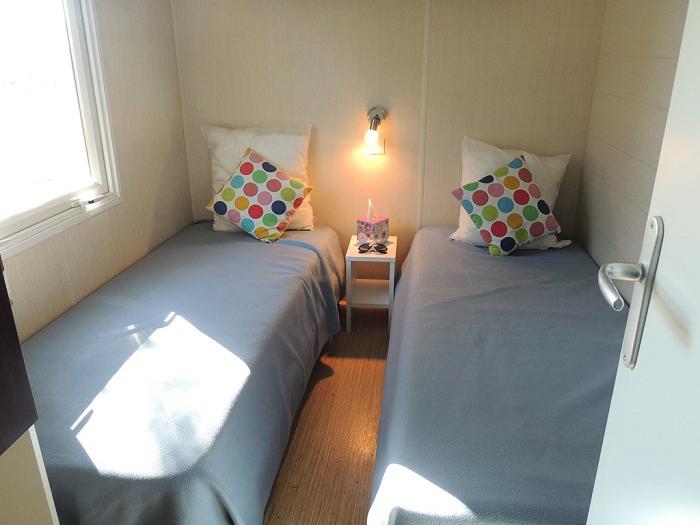 Mobil home 4 personnes, de 27m², composé d'un coin salon, d'une cuisine, d'une chambre avec un lit double, d'une chambre avec 2 lits simples, d'une salle de bains avec douche et de WC séparés.