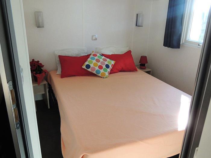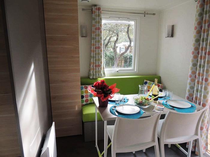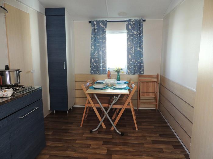 Mobil Home 4/6 personnes, de 27m², composé d'une cuisine, d'un coin salon avec canapé convertible 2 personnes, d'une chambre avec un lit double, d'une chambre avec 2 lits simples, d'une salle de bains avec douche et WC séparés.