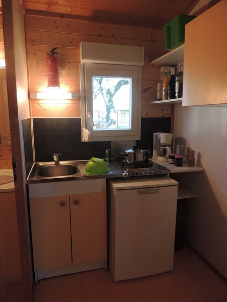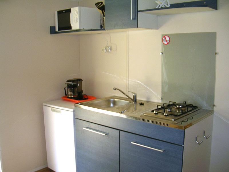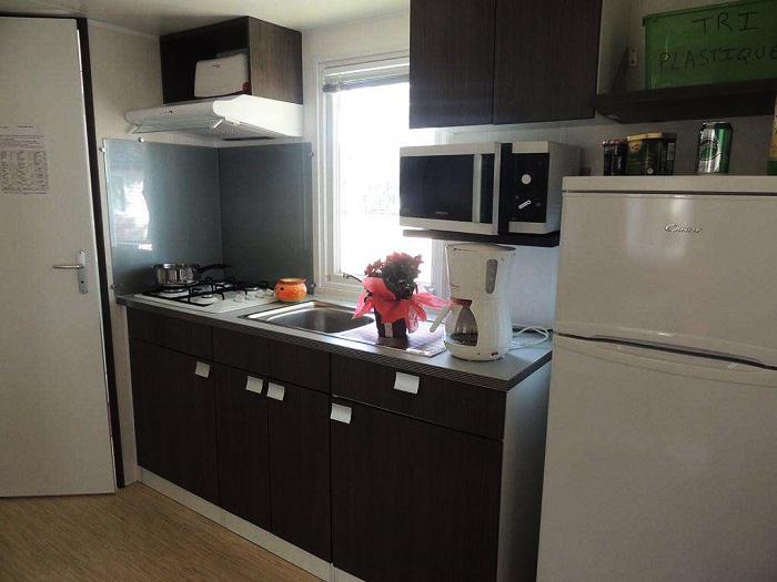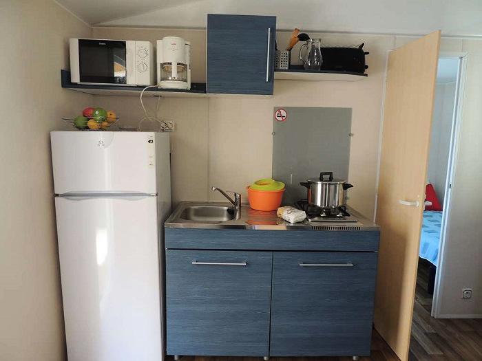 Le mobil home comprend une cuisine équipée avec 2 plaques de cuisson, micro-ondes, grille-pain, frigo / congélateur, cafetière électrique et vaisselle.