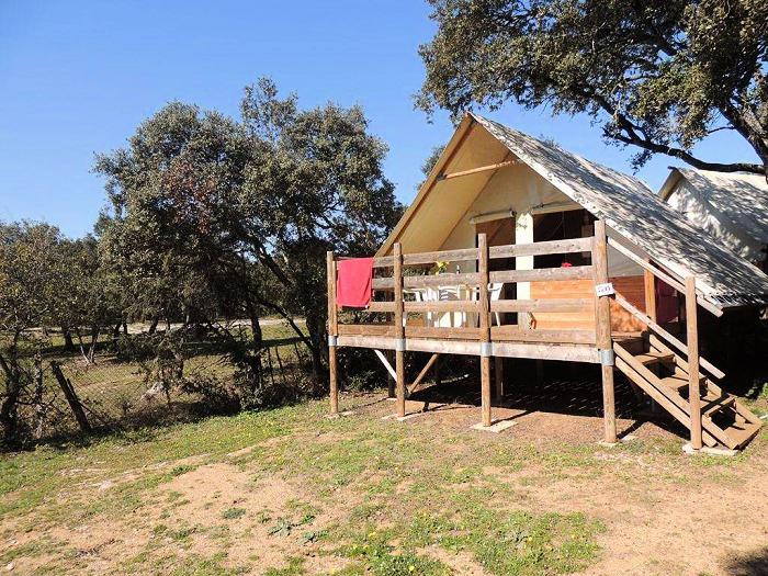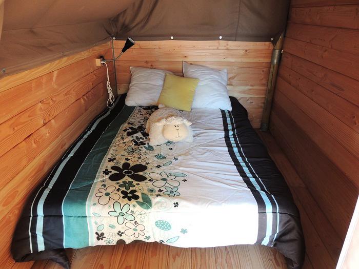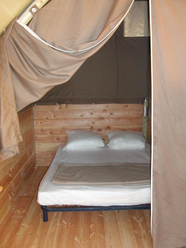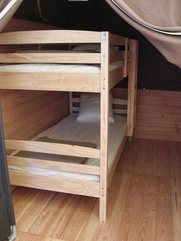 Bungalow toilé 4 personnes, de 20m², composé d'un coin cuisine, d'une chambre avec un lit double, d'une chambre avec 2 lits superposés, d'un coin repas et d'une terrasse semi-couverte de 10m². A noter : pas de sanitaires dans ce logement - Sanitaires à proximité