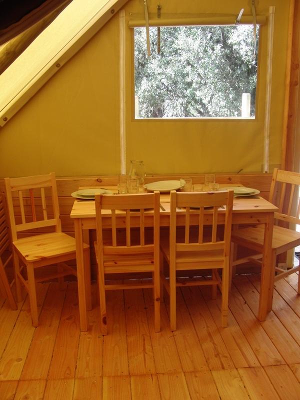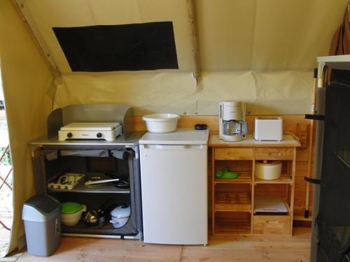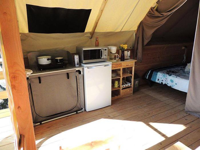 Le bungalow toilé comprend une cuisine équipée avec plaque électrique, four micro-ondes, grille-pain, frigo, cafetière et vaisselle. La terrasse est équipée d'un salon de jardin.