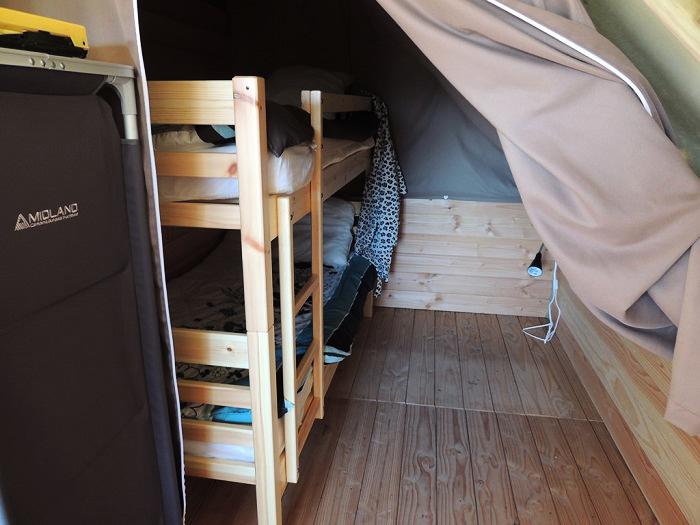 Bungalow toilé 4 personnes, de 20m², composé d'un coin cuisine, d'une chambre avec un lit double, d'une chambre avec 2 lits superposés et d'un coin repas.A noter : pas de sanitaires dans ce logement - Sanitaires à proximité