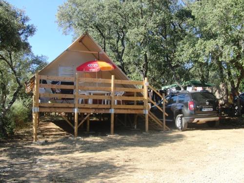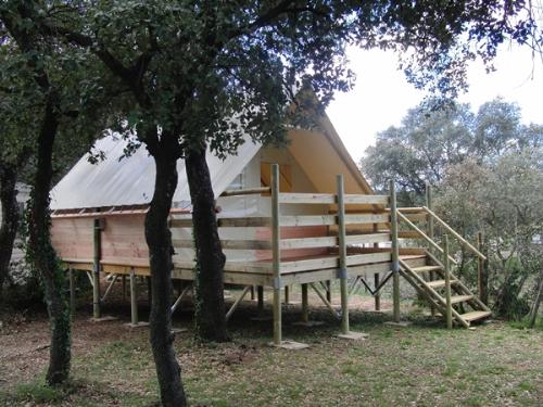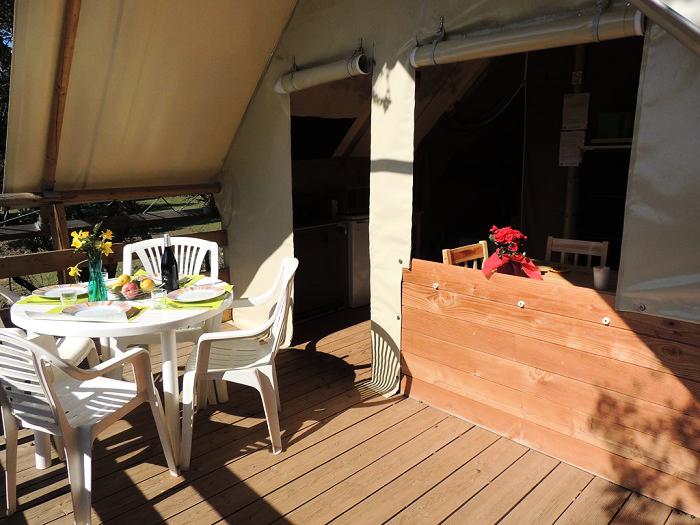 Le bungalow toilé comprend une cuisine équipée avec plaque électrique, four micro-ondes, grille-pain, frigo, cafetière et vaisselle.Il dispose également  d'une terrasse semi-couverte avec salon de jardin.Les couvertures et alèses sont fournis.