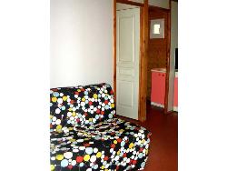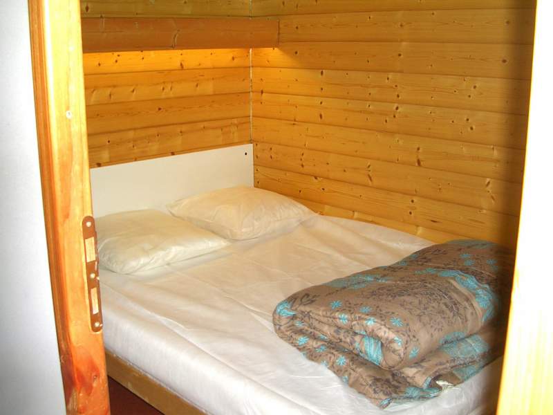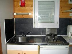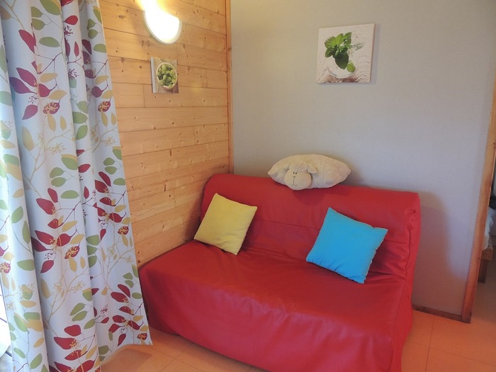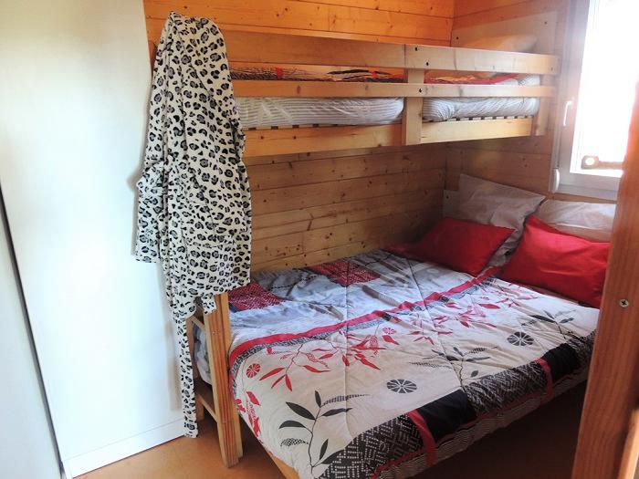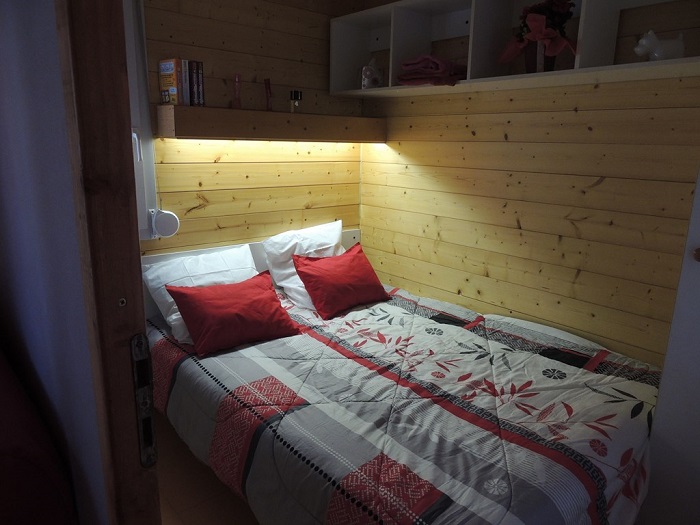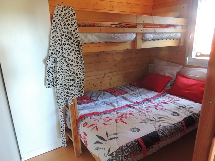 Chalet pour 5/7 personnes, de 27m², composé d'une cuisine, d'un coin salon avec canapé convertibles pour 2 personnes, d'une chambre avec un lit double, d'une chambre avec un lit double et un lit superposé et d'une salle de bains avec douche et WC.